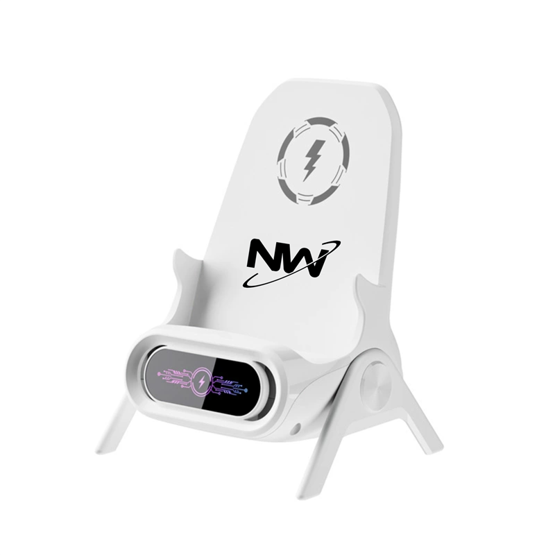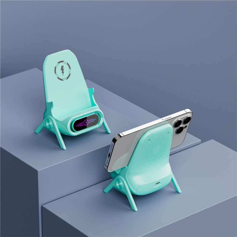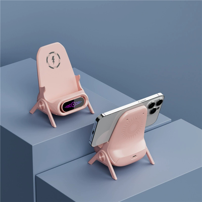 The material of this phone holder is ABS. It is a multifunctional phone holder. It can be charged wirelessly, with a small night light, and can be physically amplified. It can support mobile phones or tablets.