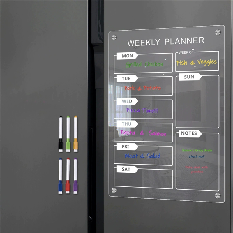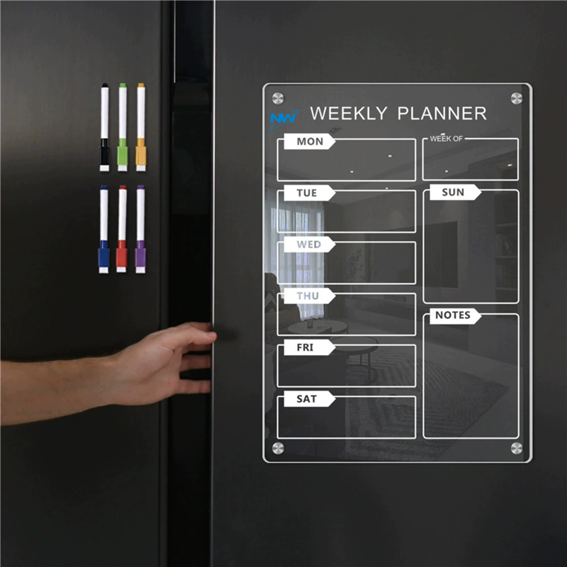 This calendar board is made of acrylic. Its surface is reusable and erasable, allowing you to easily update plans. It is equipped with four magnets that can be connected to a refrigerator, metal cabinet, or any magnetic surface. Equipped with six magnetic pens. Can customize your logo and pattern.