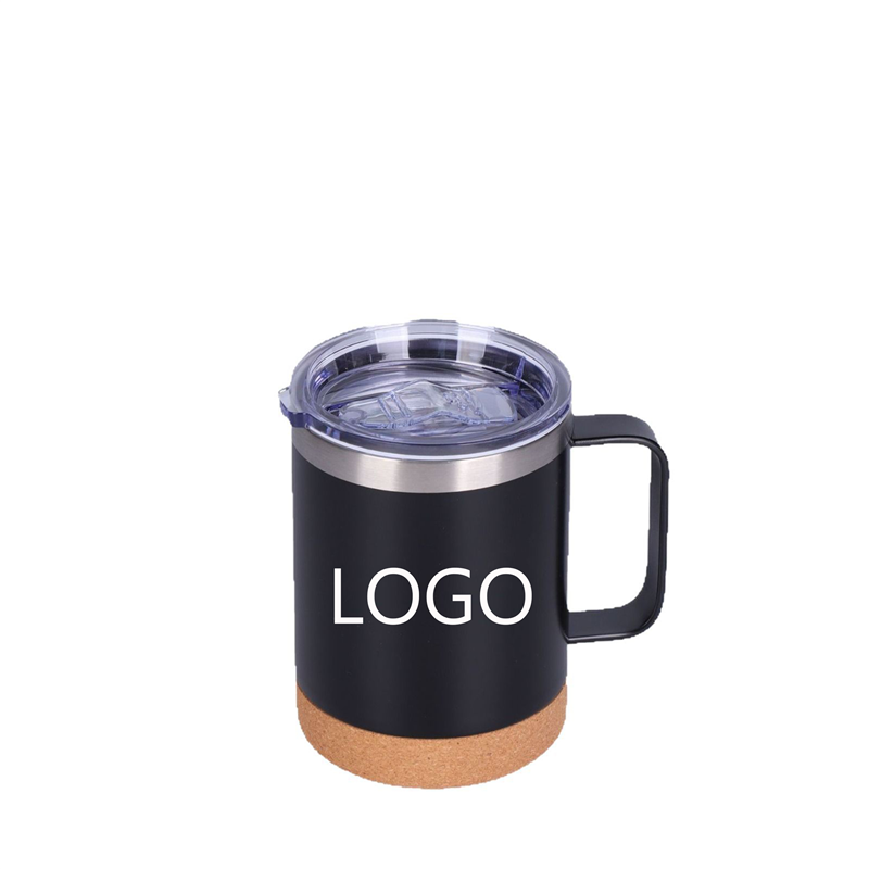 This mug has a powder-coated finish to prevent condensation and a removable cork bottom to protect your surfaces from heat and scratches. Clear plastic press-in lid and large rectangular handle. Wide opening making it easy to fill with ice. You can also customize your logo on it.